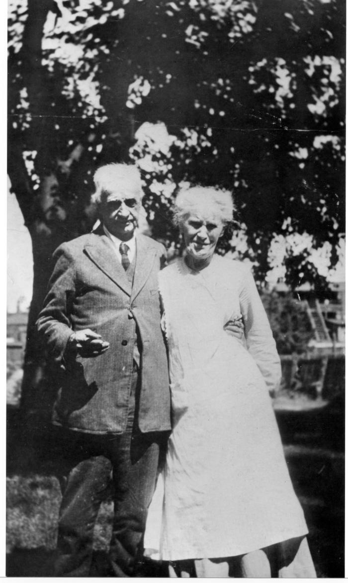 William Upton (1835 - 1923) and his wife, Sarah Upton (1845 - ?) stand near a large tree on a farm. He has his arm around her. This may have been after they moved from the Dodge Park Road house and were living in Rochester, Michigan.