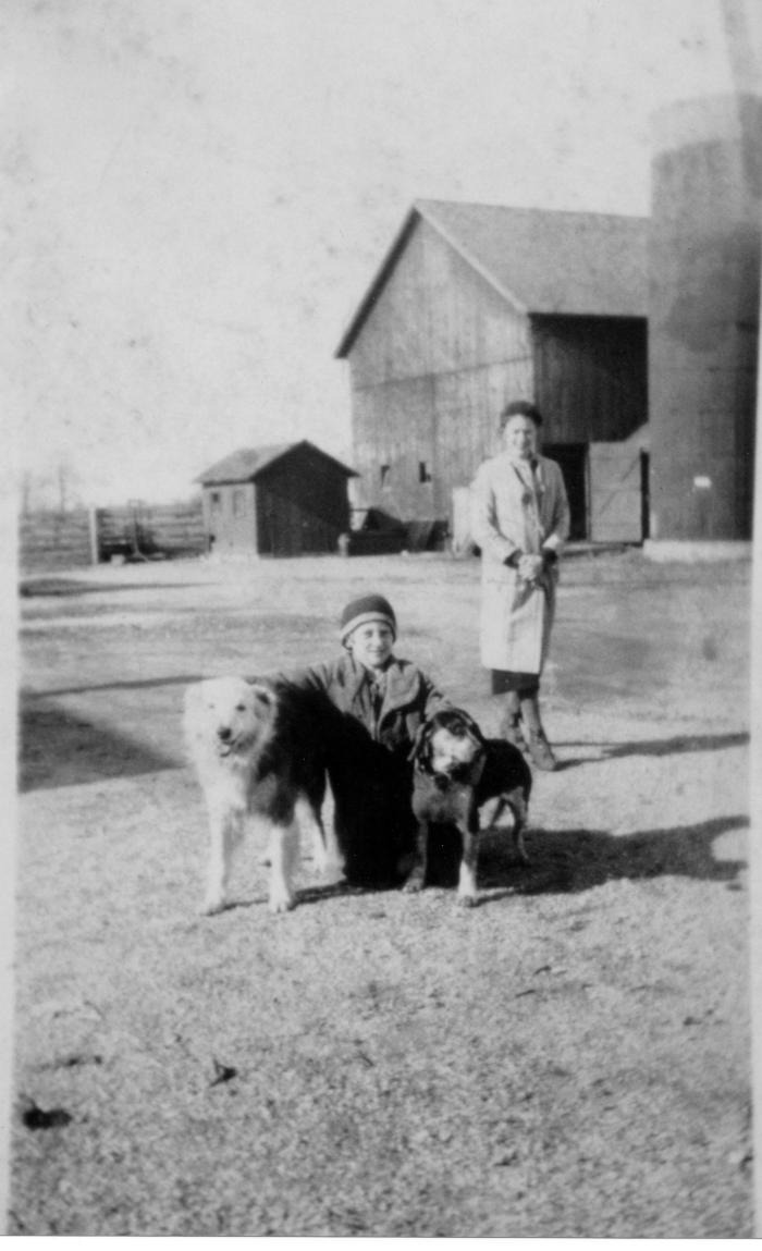 Shirley Hacker (1929-1982) and Norma Hacker standing in front of barn and silo, with 2 dogs. Shirley and Norma are sisters.