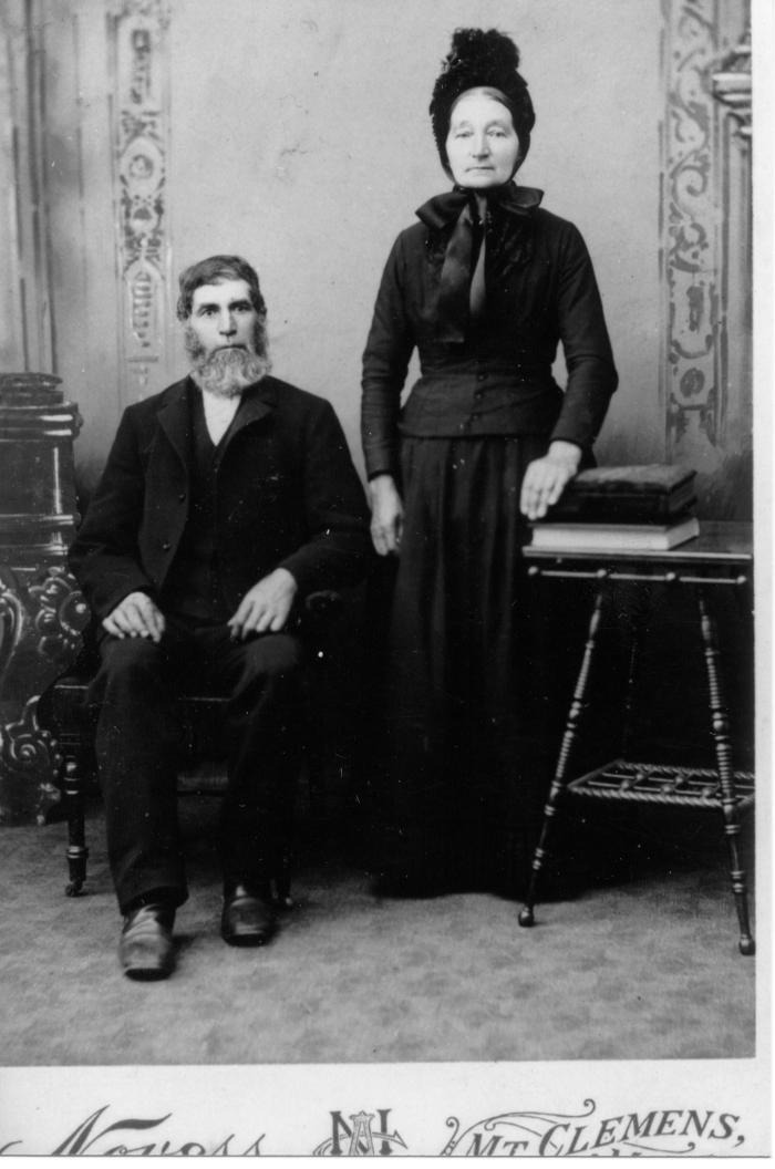 Frederick Karr (1835-1905) and Fredericka Zimmerman Doebler Karr (1832-1910). After Fredericka's first husband, John Doebler (1830-1860) died, she married Frederick Karr. The Karrs lived in a log cabin on the north side of 19 Mile Rd. between Clinton River Rd. and Schoenherr Rd in Sterling Heights, Michigan.