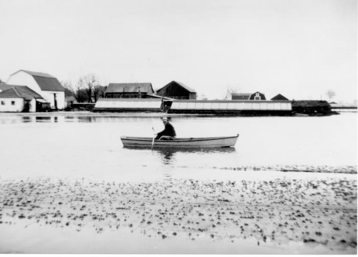 Remi Van den Brouck (1898 - 1987) sits in a small boat with oars floating on his flooded carrot field. Many barns and outbuildings show in background. Farm was on Hall Road, east of Schoenherr Road, where Lakeside Mall is now. in Sterling Heights Michigan.