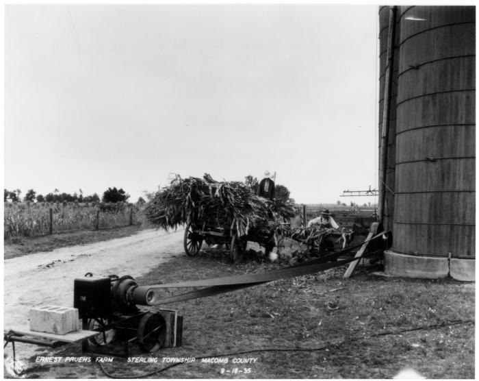 Wagon full of corn stalks is being loaded into silo on Pruehs Farm located on southwest corner of Dodge Park Road and 16 Mile Road in Sterling Heights, Michigan. Dodge Park Road is unpaved road running through center of photo. An electric motor runs the farm machine that is chopping the corn. Man in photo may be Ernest Pruehs (1892 - ?). The young woman helping in wagon may be his daughter Evelyn. Photo has Detroit Edison seal on corner.