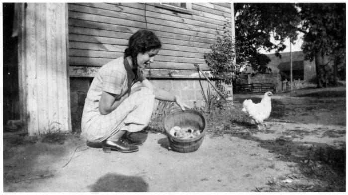 Ruth Ahrens (Sochowski) (1920-2002) outside her house showing a bushel basket full of chicks, with hen nearby.