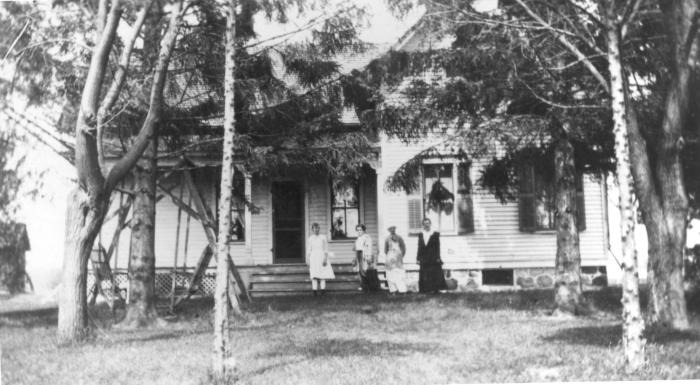 Farmhouse located on the south side of Clinton River Rd., just west of Hayes Rd in Sterling Heights, Michigan. Four people stand in front of the house, all unidentified. Large pine trees grow in front of the house, and a wooden 2 seat swing sits on the lawn.
