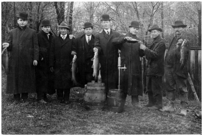6 formally dressed businessmen with Otto Ahrens (1890 - 1969) and his father, Charles Ahrens (1857 - 1943) at right, displaying large fish caught, with beer kegs in foreground.