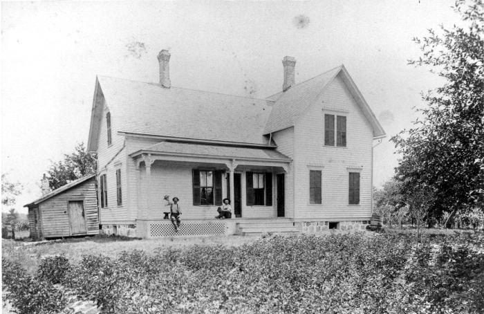 Ahrens family home, located on the south side of Clinton River Rd., just west of Hayes Rd. in Sterling Heights, Michigan Charles Ahrens (1857 - 1943) sits on the porch with his daughter Martha Ahrens (b. 1886). Other man is unidentified.