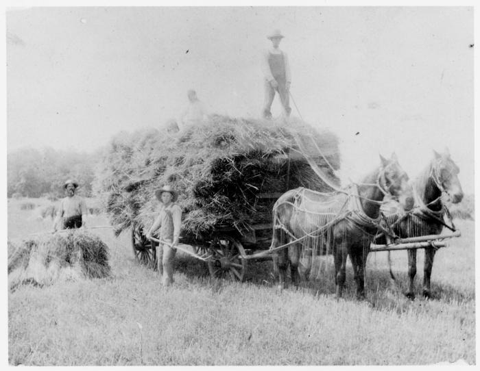 Charles Ahrens (1857- 1943) and son, Albert (1902-1990)? and unidentified family members on top of wagon pulled by 2 horses.