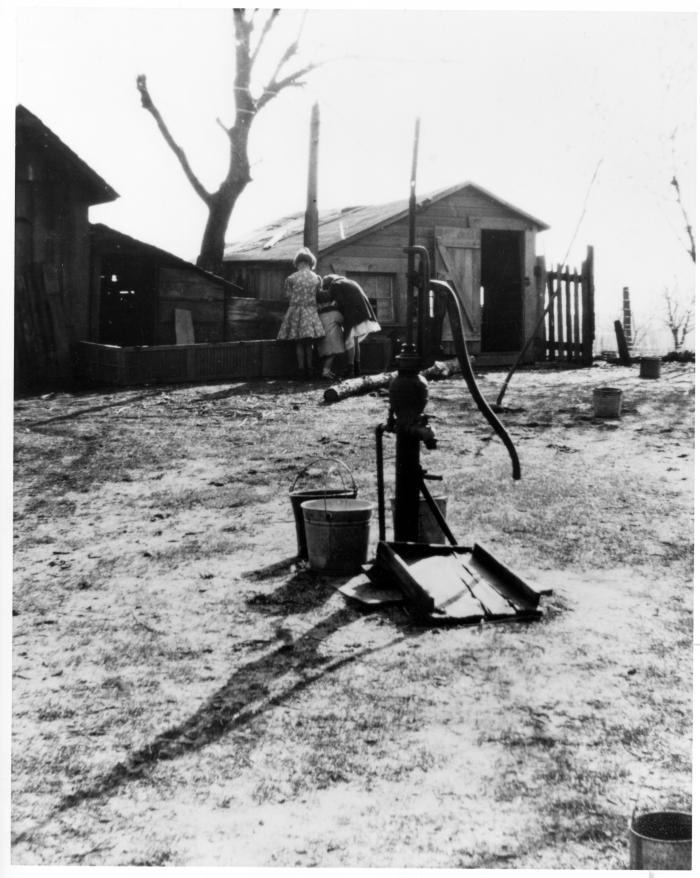 Outdoor water pump on Ahrens farm showing farm outbuildings and the backs of 3 young girls in background. 3 metal pails sit next to pump.