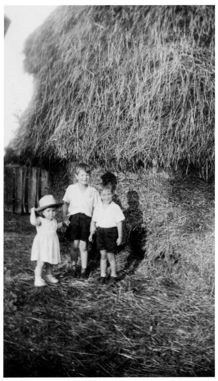 Joyce, Terry, and Dennis Pozehl on Ahrens farm standing in front of a huge stack of straw.
