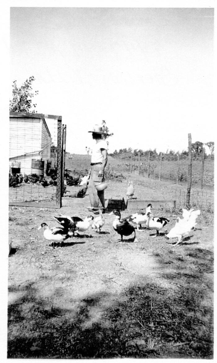 Emin Backus (1890 - 1969) feeding chickens and ducks on Backus Farm, 7447 17 Mile Rd., west of Van Dyke in Sterling Heights, Michigan. The Backus family ran the Backus Car Wash very near the site of their farm.