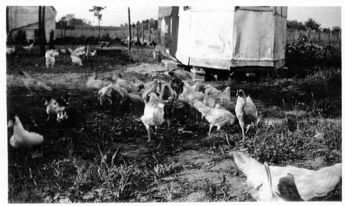 Two dozen chickens in yard on Backus farm, 7447 17 Mile Rd. in Sterling Heights, Michigan