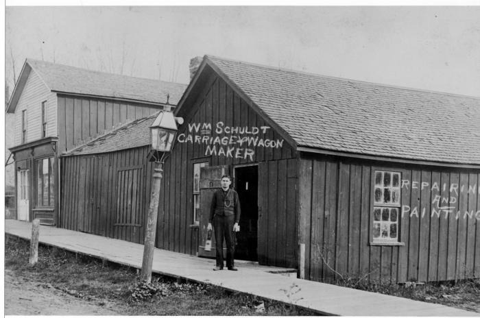 William Schuldt (1877-1968) stands on board sidewalk in front of his carriage and wagon shop in Utica, Michigan. Old lamp post in front, unpaved road, another unnamed business is nextdoor.