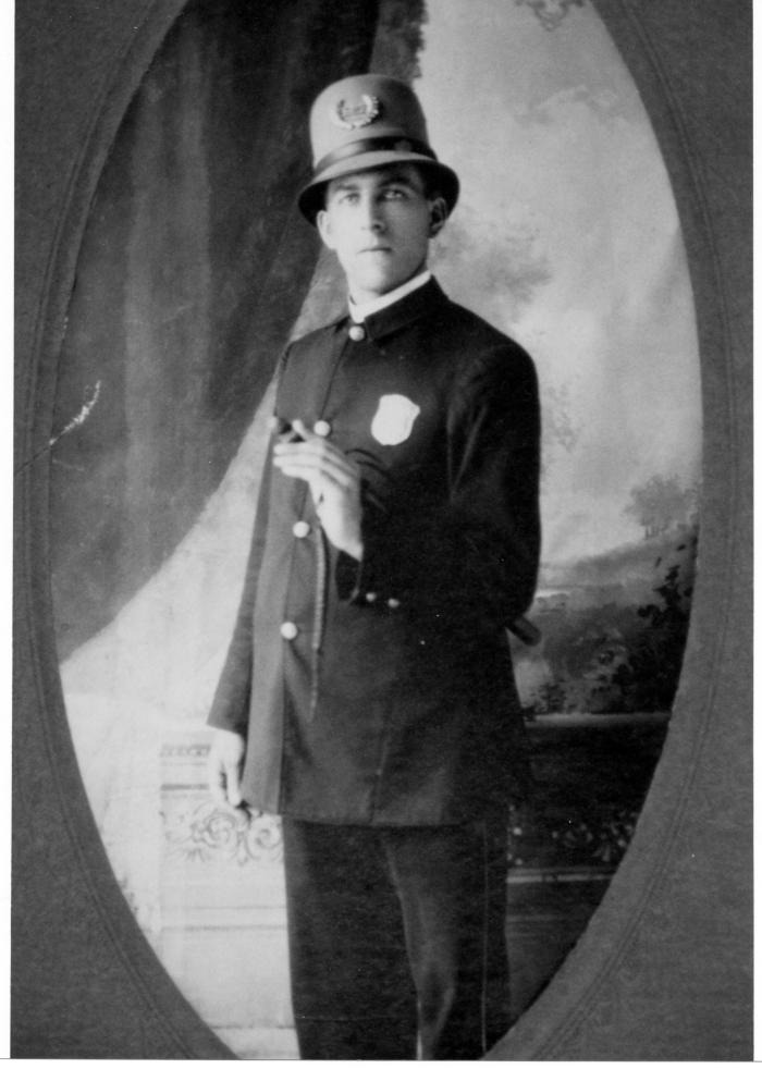 Louis Hacker (1881-1964) studio portrait, wearing uniform of Detroit Police, wearing hat and holding night stick.