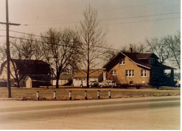 Albert Landerschier (b. 1890?), wife Vernie, and children Norman and Wilma lived in this tan brick house on the northwest corner of 18 Mile Road and Van Dyke Road in Sterling Heights, Michigan. Shows barn, outbuildings, car in drive. Van Dyke Road is paved.