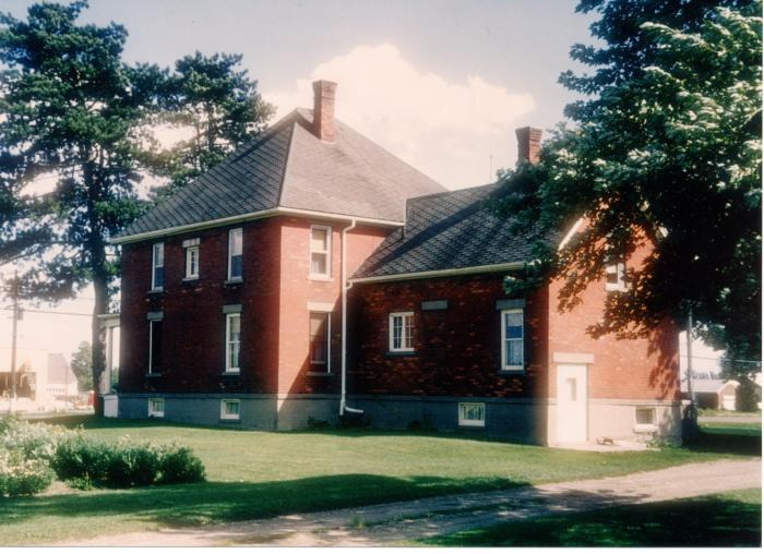 Alfred Landerschier (1898 - 1995)'s red brick house on southwest corner of 18 1/2 Mile Road and Van Dyke Road in Sterling Heights, Michigan. Rear view showing back of house, small garden and some buildings across Van Dyke Rd.