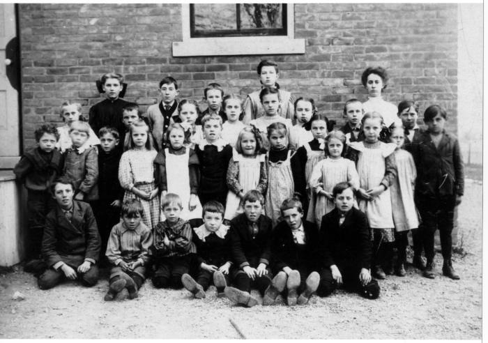 32 boys and girls and a female teacher pose next to the red brick Burr School located on the east side of Ryan Road between 18 and 19 Mile Roads in Sterling Heights, Michigan.