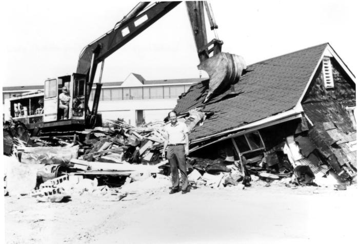 John Urquhart, co-owner with Victor Martin, of the Sterling Inn, stands in front of the ruined remains of original Sterling Motel built c. 1955. A back hoe is poised behind him.