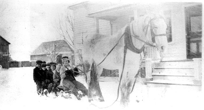 Lilly Couser (1883 - 1973) and Kleino children sit on a snow sled with a horse posed in front as if to pull them. Snowy scene in front of the Kleino farmhouse on Kleino Rd., north of Utica Rd. Barns are on the north side of the house. In Sterling Heights, Michigan.