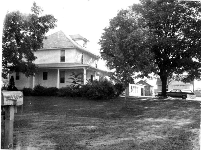 Haff Farmhouse, Dequindre Road, south of M-59 in Sterling Heights, Michigan. Summer view from the road showing mailbox, station wagon in driveway, outbuildings in background. Hand lettered sign reads