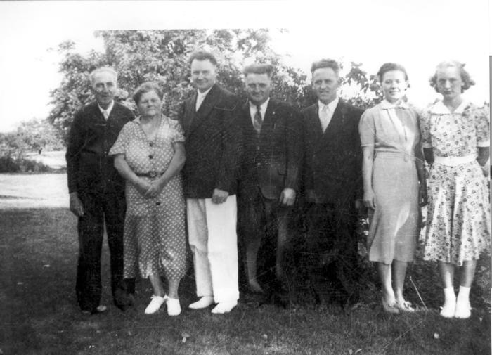 Lewis Kleino (b. 1875) and Martha Rewoldt Kleino (b. 1880) and their children: Elmor Kleino (1904 - 1998), Edgar Kleino (1906 - 1962), Melvin Kleino (1907 - 1993), Marion Kleino Reindel (b. 1912), and Norma Kleino (Schurig) (1923 - 2002). They pose outdoors on the lawn in the summer, wearing dresses and suits.
