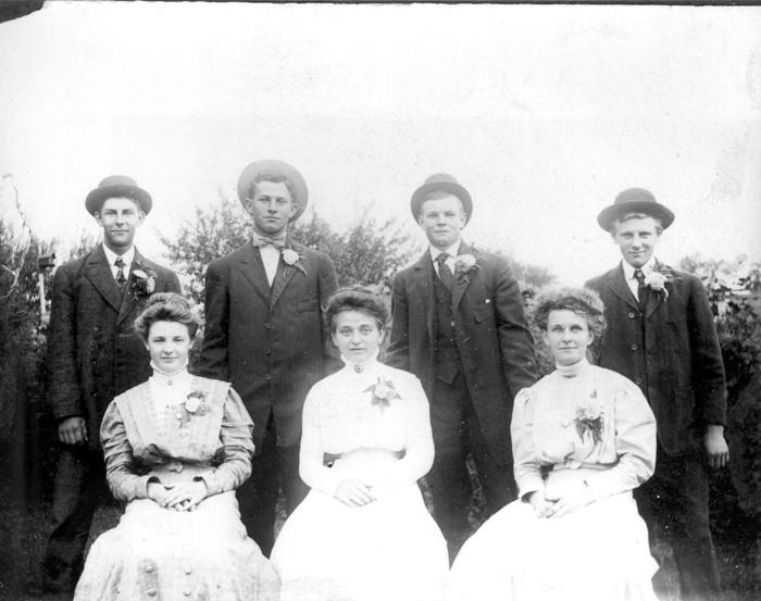 Group of seven teenagers posing outdoors, boys wear boutonnieres and hats, girls wear corsages. Seated: Carrie Moldenhauer Weinert (1889 - 1987), Helen Uhlig, Martha Ahrens Sieger (b. 1886). Standing: Otto Ahrens (1890 - 1969), Albert Weinert (1890 - 1976) (married Carrie), Art Moldenhauer, Carl Ahrens (1893 - 1974).