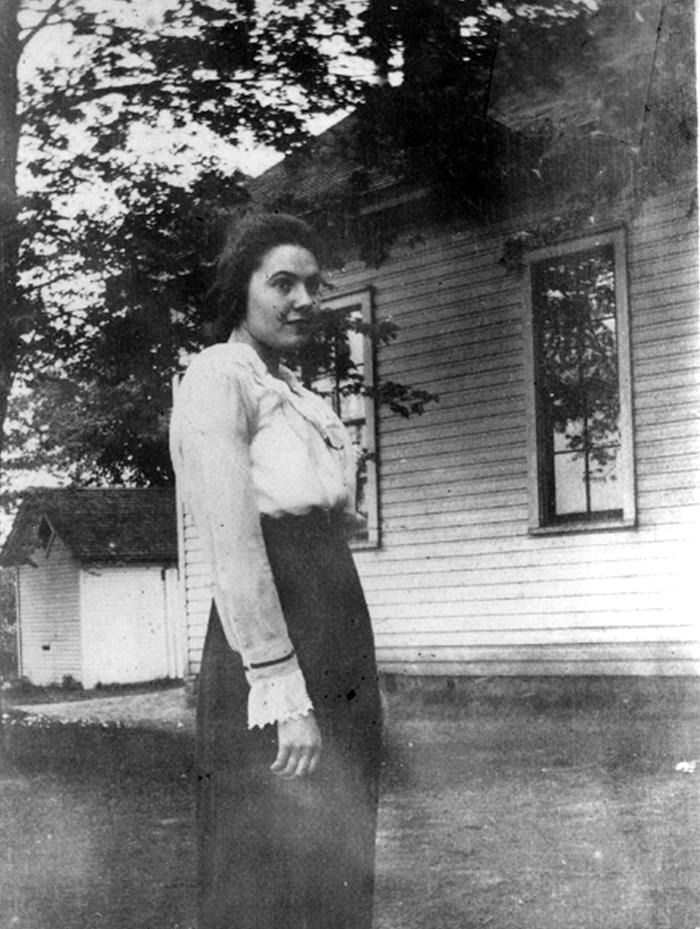 Irene Friedhoff stands outside of MapleGrove School, wearing white blouse and dark skirt. School was on Kleino Rd. at Utica Rd. in Sterling Heights, Michigan. Irene was a teacher at the school.