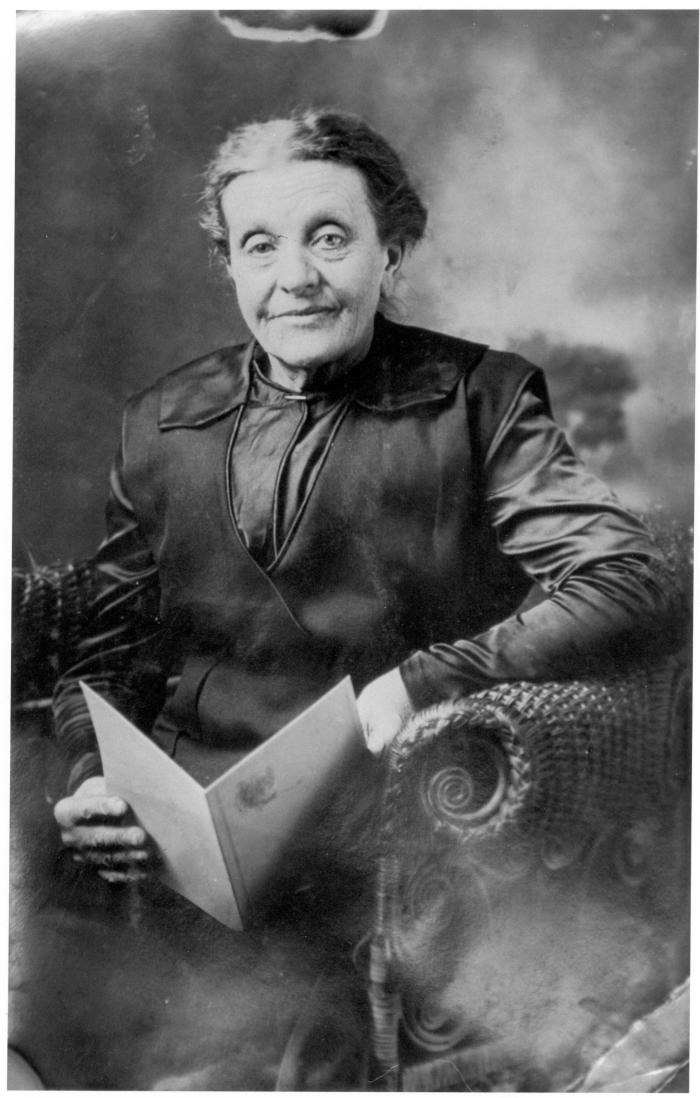 Studio portrait of Catherine Hacker (b. 1855) shown wearing a dark dress, sitting in a rattan chair, and holding an open booklet.