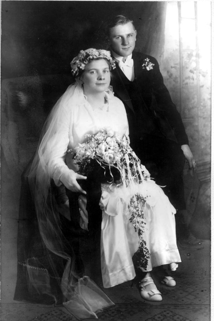 Studio portrait of Ella Foerster Ahrens (1892 - 1965) and Carl Ahrens (1893 - 1974). Ella wears a wedding gown and is seated, Carl stands next to her.