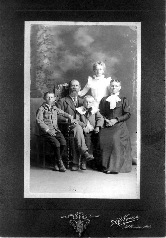 Studio portrait of seated parents, Charles Ahrens (1857 - 1943) and Louise Arft Ahrens (1866 - 1957). Children: Otto (1890 - 1969), Carl (1893 - 1974), and Martha (1886 - ?).