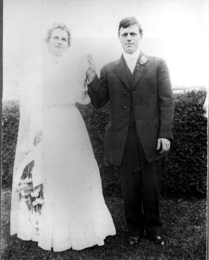 Full length outdoor pose of Martha Ahrens (b. 1886) wearing a white wedding dress holding the hand of her busband, Arthur Sieger on their wedding day.