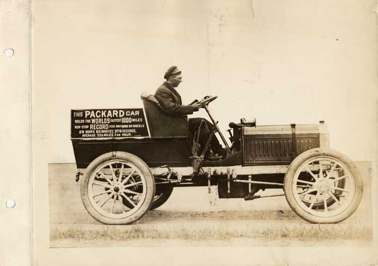 7.5x11 black and white sepia-toned Packard Co. file photograph of a 1906 Packard car right side view, pictured with a male driver. The side of the car reads: this Packard car holds the worlds fastest 1000 miles non-stop record for anything on wheels, 29 hours, 53 minutes, 37 and three eights seconds. Average, 33 and one half miles per hour.