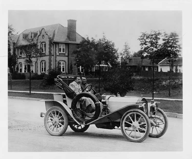 8x10 black and white Packard Co. file photograph of a 1907 Packard 30 Model U near 484 E. Grand Boulevard, down the street from the Packard Plant in Detroit, MI, with driver Henry B. Joy and passenger Frederick Alger. One of the houses in background is the home of Julius H. Haass, president of the Home Savings Bank. Inscribed on photo back: 4-cylinder, 30-horsepower, 108-inch wheelbase, 2-person roadster with rumble seat, special fitments, headlamps and folding victoria top, photographed spring 1907, driver Henry Joy, passenger Frederick M. Alger.