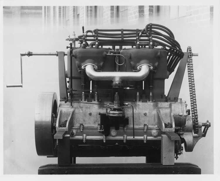 8x10 black and white print copied from a glass negative of a 1907 Packard 30 Model U engine on wood table. Inscribed on photo back: 4-cylinder, 30-horsepower, production, engine, right side, set up for testing.