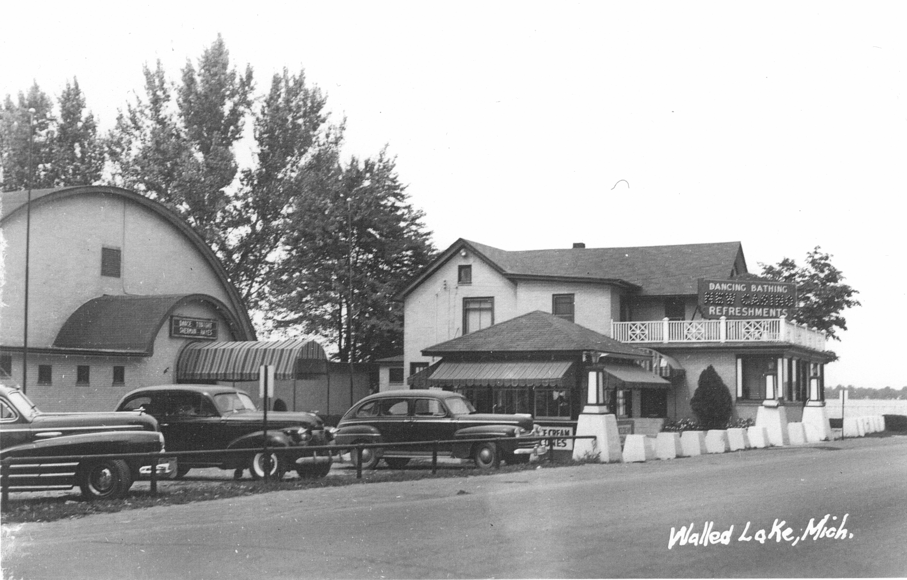 Black and white photograph of entrance to New Casino dance hall, Walled Lake, Michigan, ca. 1942