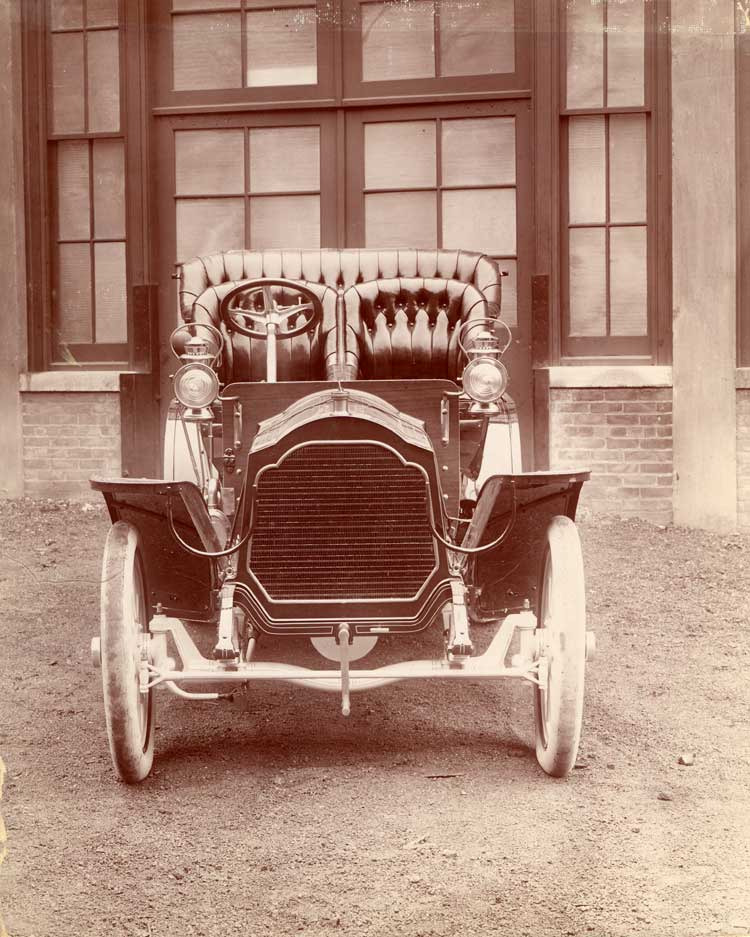 7.5x9.5 black and white sepia-toned photograph of a 1907 Packard 30 Model U. Inscribed on photo back: 4-cylinder, 30-horsepower, 122-inch wheelbase, 5-person touring car, front elevation, photographed at Packard Works, East Grand Blvd., Detroit, Michigan.
