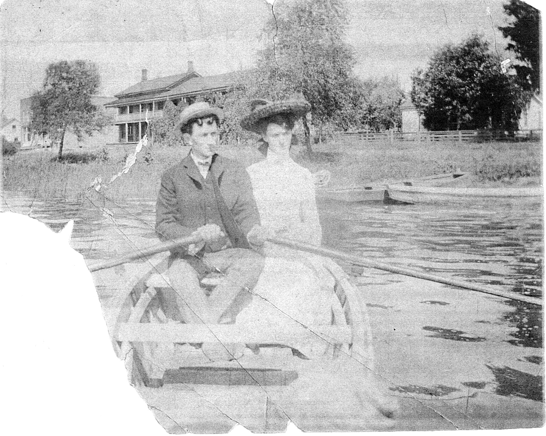 Black and white photograph of Henry and Barbara McKnight in rowboat on Walled Lake.
