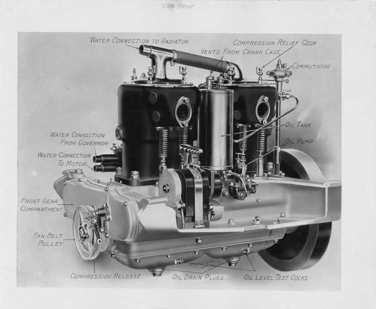 8x10 black and white Packard Co. file photograph of a 1908 Packard 30 Model UA three-quarter front view-left side, engine parts labeled on front. Inscribed on photo back: 4-cylinder, 30-horsepower, engine, retouched photograph by Peninsular, Detroit, Michigan.