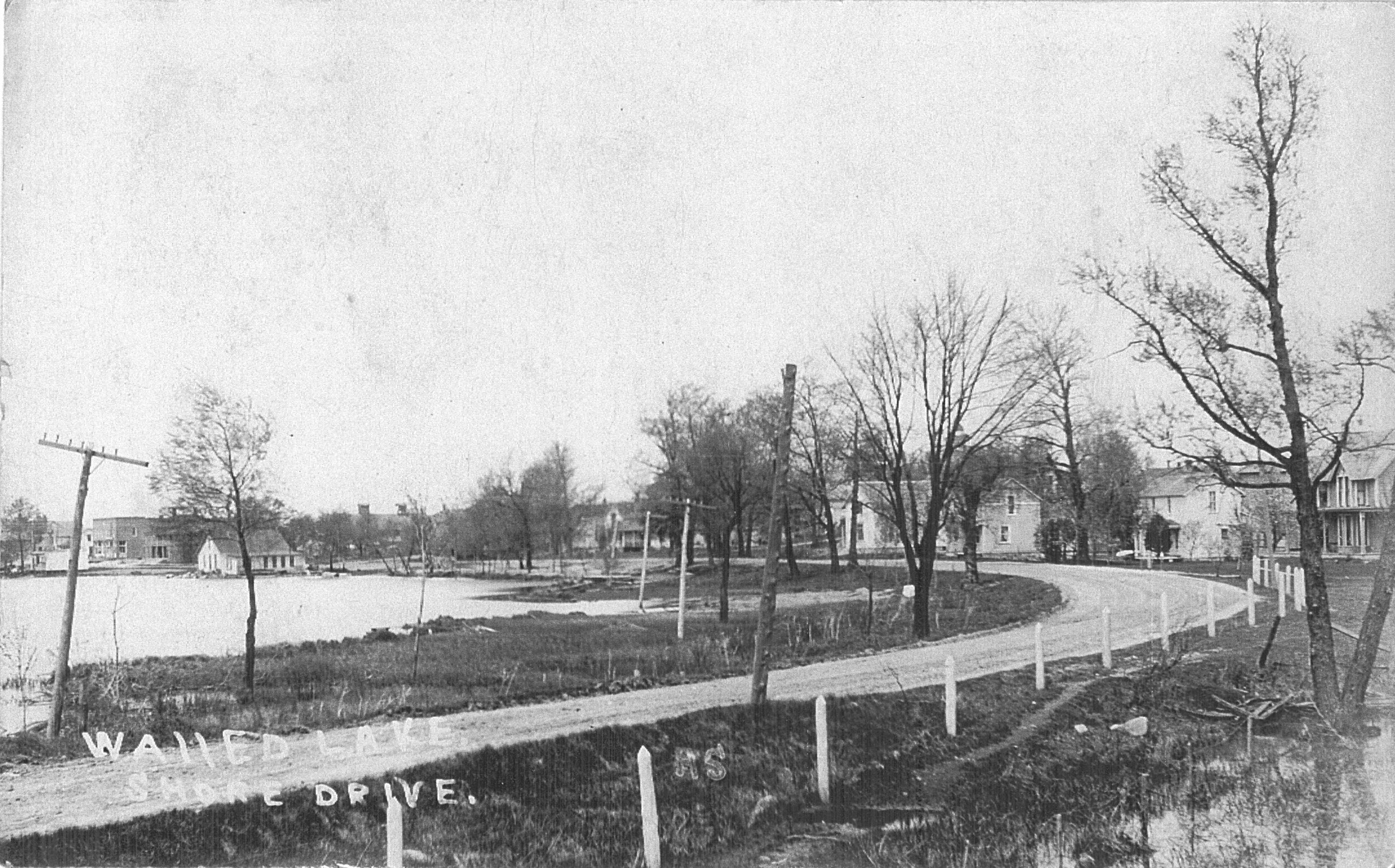 Front of postcard showing Shore Drive, village of Walled Lake, MIcigan. postmarked July 12, 1909.