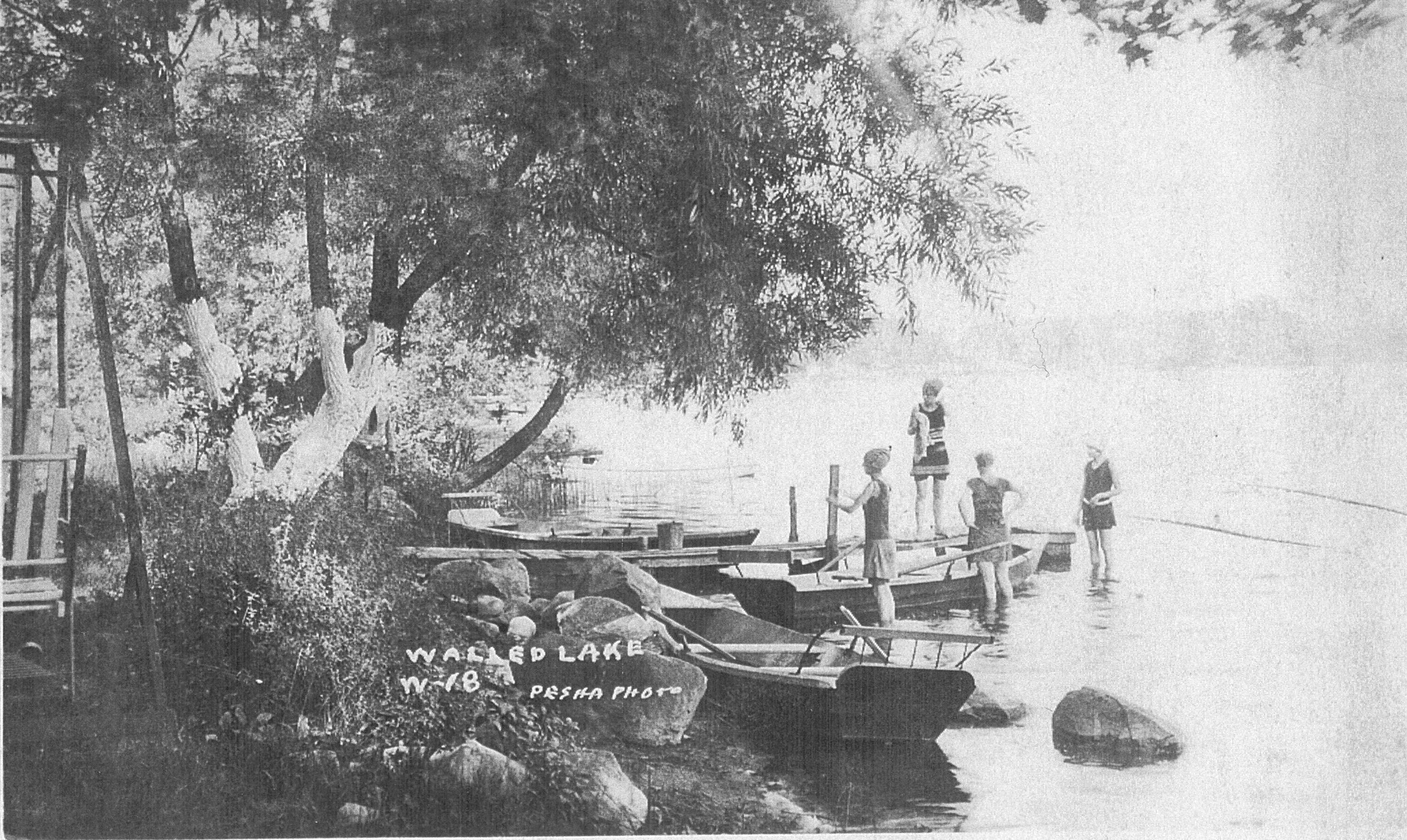 Photocopy of postcard showing rowboats and swimmers on shore of Walled Lake, c. 1900.