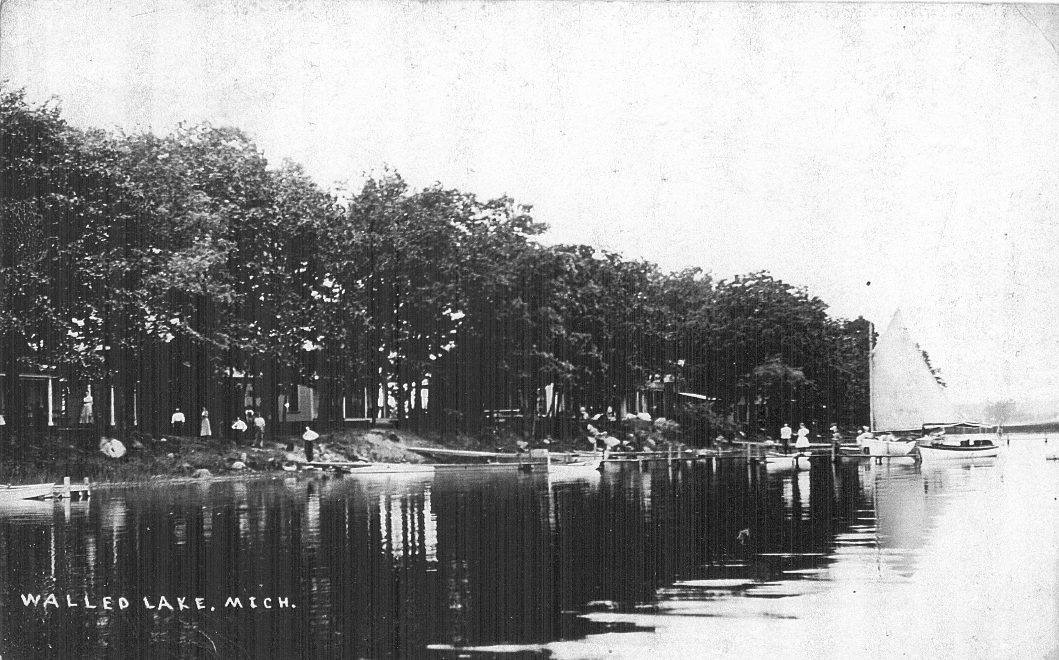 Front of postcard showing Walled Lake shoreline, postmarked May 25, 1911.