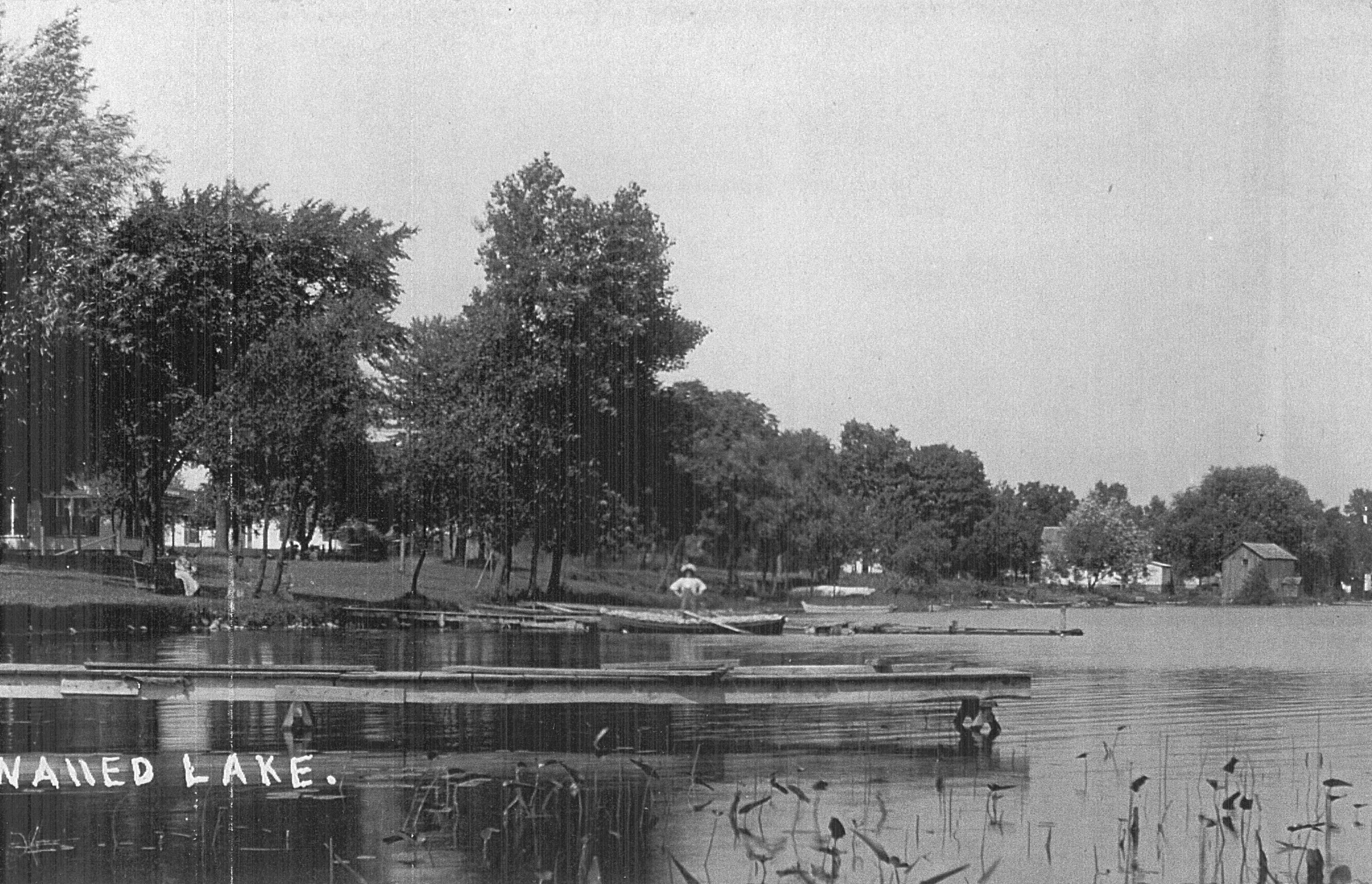 Photocopy of postcard showing Walled Lake shoreline, c. 1900