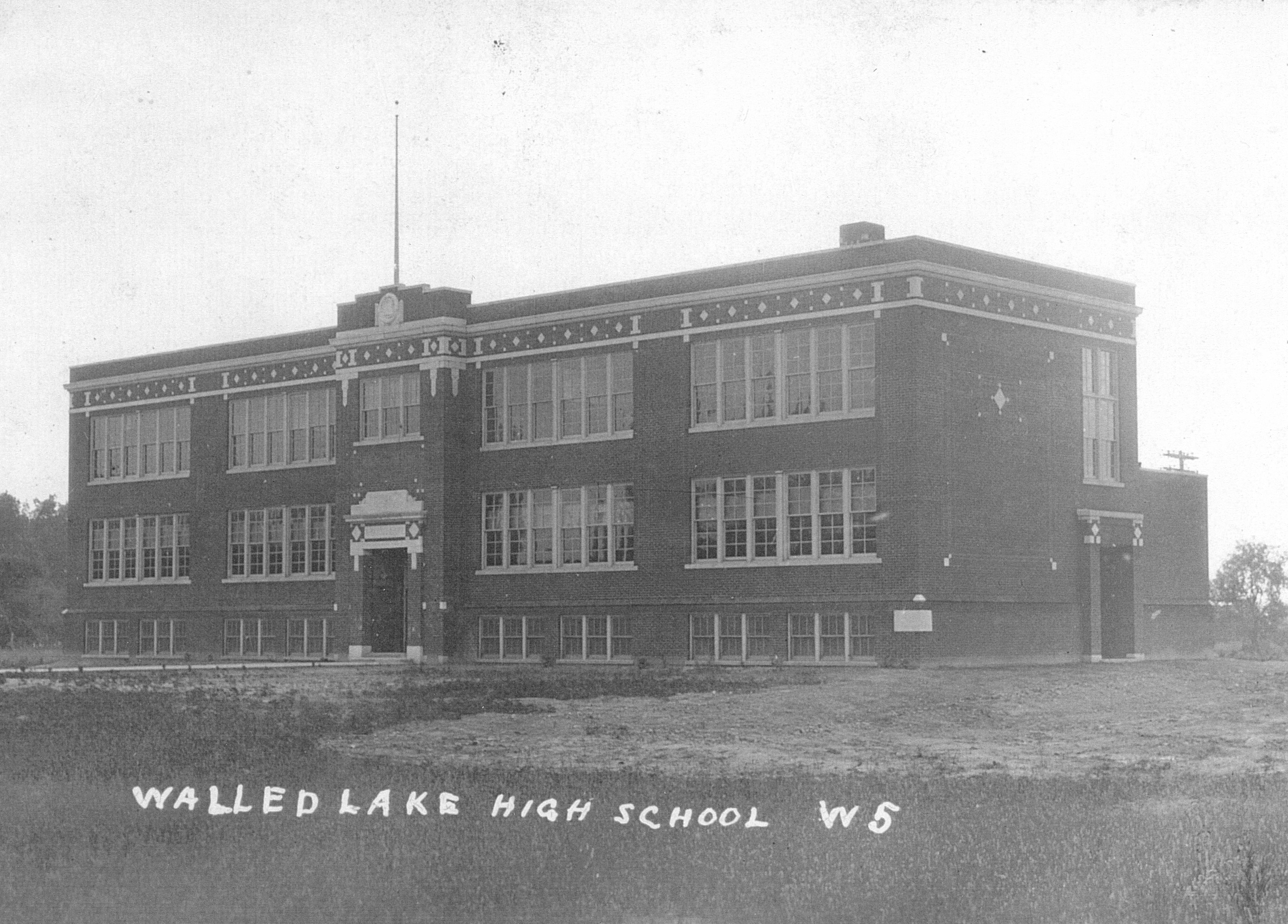 Undated black and white photograph of Walled Lake High School, Walled Lake, Michigan.