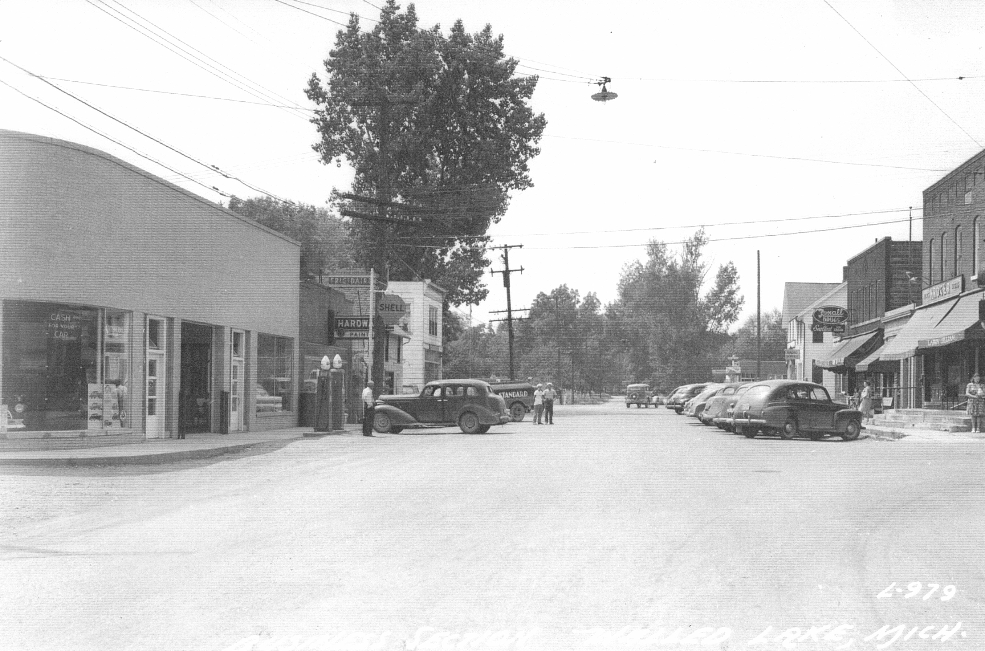 Black and white photograph of downtown Walled Lake, c. 1940.