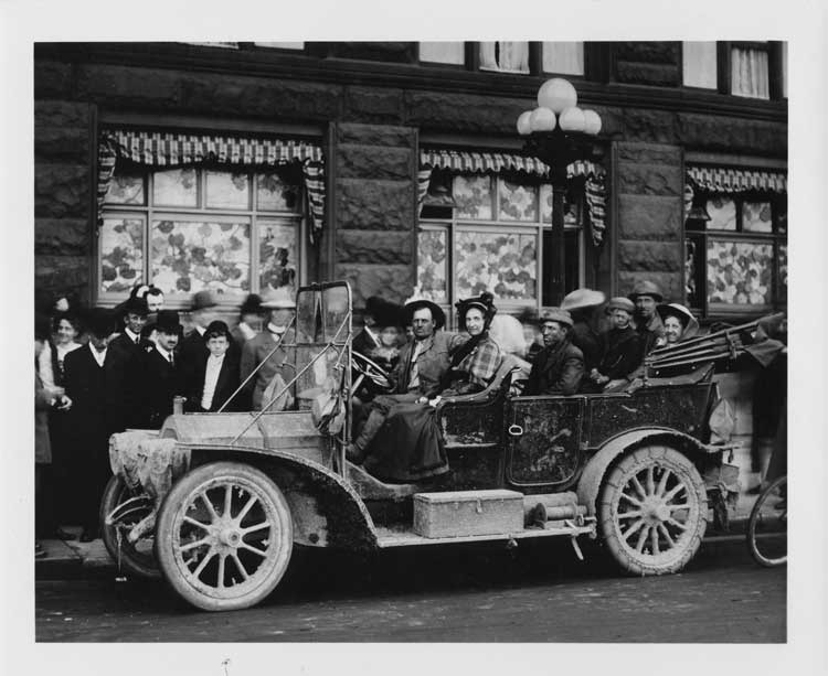 8x10 black and white photograph of a mud-spattered 1908 Packard 30 Model UA with female driver, three male passengers, three female passengers, and a small boy, parked on a city street in front of a brick building, several onlookers. Inscribed on photo back: Murdock expedition.