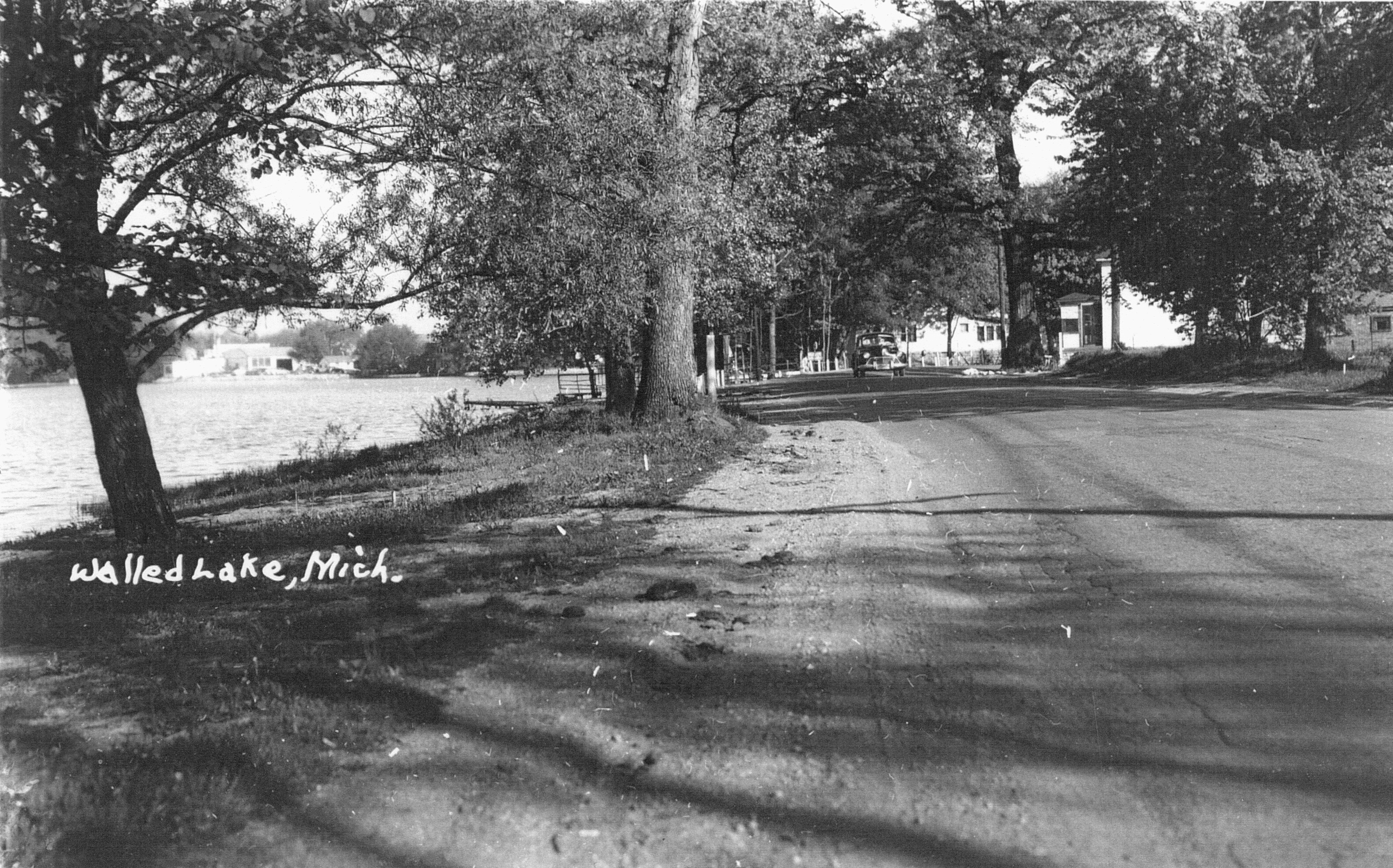 Black and white photograph of Lake Shore Drive, Walled Lake, Michigan, c. 1940.