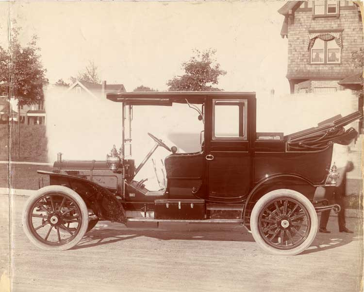 1908 Packard 30 Model UA landaulet, left side view with houses in background