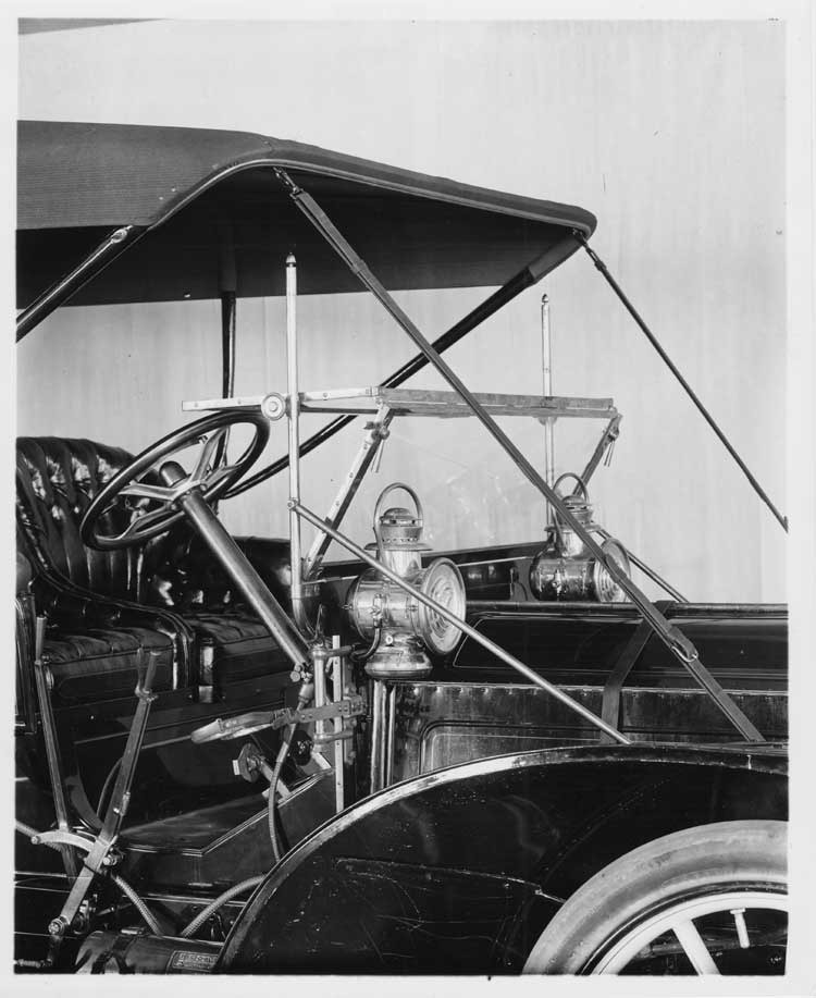 8x10 black and white print copied from a glass negative of a 1909 Packard 30 Model UB windshield detail, half folded. Inscribed on photo back: 2-piece folding glass front windshield, shown here in half folded position, & mounted on 1909 Packard 30 touring car.