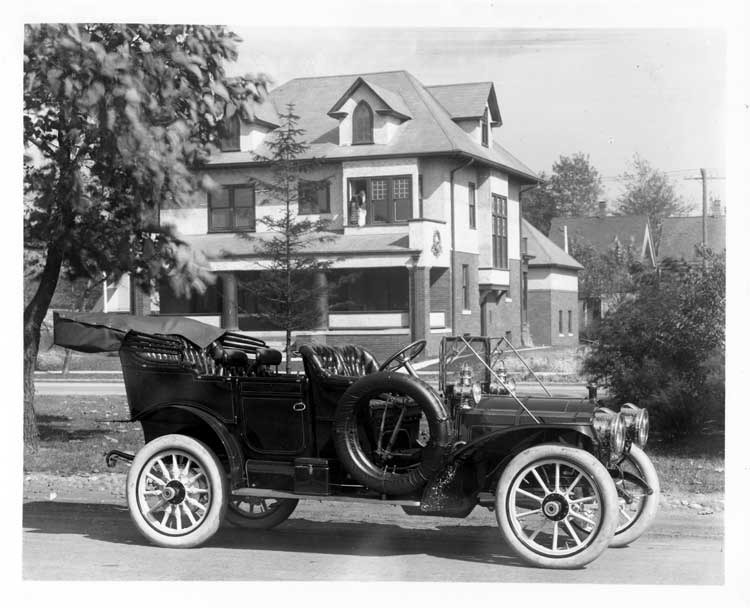 1909 Packard 30 Model UB touring car, parked on street in front of large house