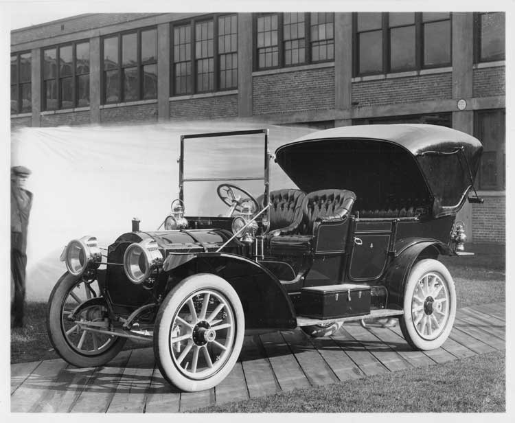 1909 Packard 30 Model UB touring car, left side, brick factory building in background