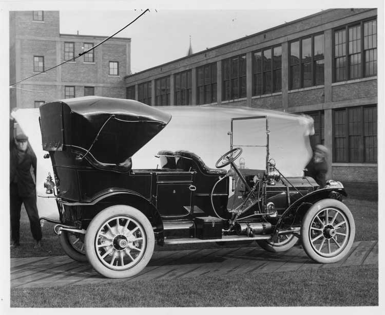 8x10 black and white print copied from a glass negative of a 1909 Packard 30 Model UB brick factory building in background, two men holding photographic drop behind car, top up. Inscribed on photo back: 4-cylinder, 30-horsepower, 123.5-inch wheelbase, touring car, fitted with leather victoria top & 2-piece folding glass front windshield, three-quarter rear view, right side, photographed at Packard Works, East Grand Blvd., Detroit, Michigan.
