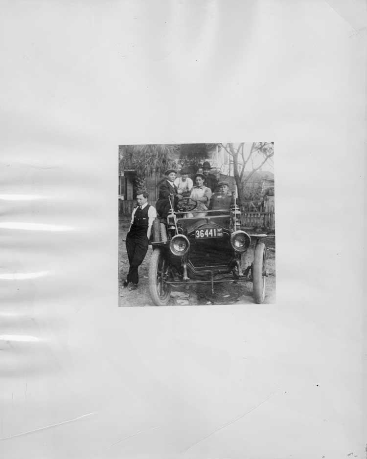 8x10 black and white Packard Co. file photograph of a 1911 Packard 30 Model UD parked in front of a house with five male passengers and male by stander. Inscribed on photo back: car bears 1913 New York license plate #3644, the snapshot was copied by Packard in 1937.